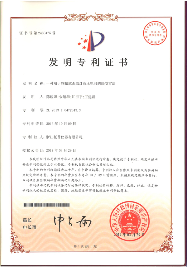 近日,我司托普云農(nóng)又喜獲一項(xiàng)發(fā)明專利。據(jù)悉,該發(fā)明專利名稱為“一種用于頻振式殺蟲(chóng)燈高壓電網(wǎng)的繞制方法”,發(fā)明專號(hào)為ZL201310472343.3。