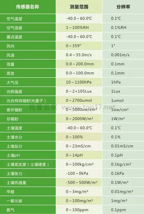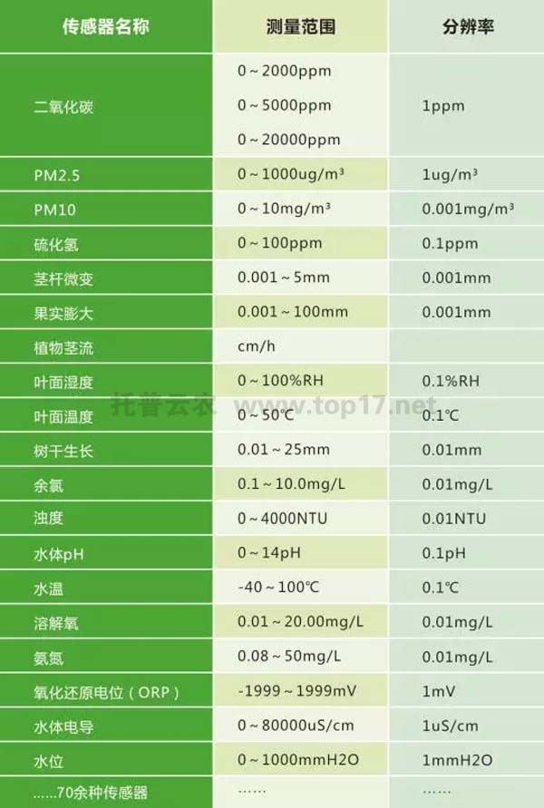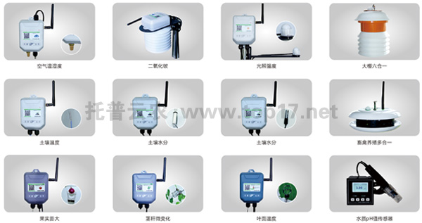 在農(nóng)業(yè)氣象方面,目前有空氣溫度、濕度、光照強度、光合有效輻射、二氧化碳、雨量、蒸發(fā)、風(fēng)速風(fēng)向、大氣壓、總輻射、紫外輻射等傳感器。同時,還有應(yīng)用于畜禽養(yǎng)殖監(jiān)測的氨氣、硫化氫等傳感器,應(yīng)用于水質(zhì)監(jiān)測的pH、余氯、濁度、溶解氧、氨氮、水溫等傳感器,應(yīng)用于環(huán)境監(jiān)測的一氧化碳、二氧化碳、甲醛、PM2.5、PM10等傳感器。