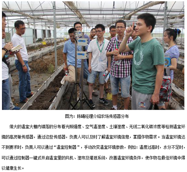 喬司農(nóng)場是浙江省首家集規(guī)模種植、科研生產(chǎn)、網(wǎng)絡(luò)銷售、宅配服務(wù)為一體的國家級(jí)農(nóng)業(yè)綜合開發(fā)綠色蔬菜生產(chǎn)基地。2014年4月中旬,托普物聯(lián)網(wǎng)系統(tǒng)在喬司農(nóng)場成功搭建運(yùn)行。 隨后的8月2日,銷售部全體員工在時(shí)任營銷經(jīng)理陳曦的帶領(lǐng)下前往喬司農(nóng)場,觀看農(nóng)場內(nèi)的物聯(lián)網(wǎng)系統(tǒng)運(yùn)行情況。