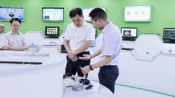 在托普云農(nóng)展廳內,唐冬壽副廳長一行聽取了陳渝陽董事長關于公司使命愿景、發(fā)展歷程、實踐案例等相關內容的匯報。
