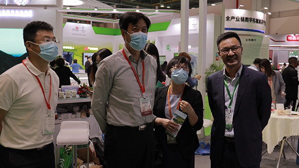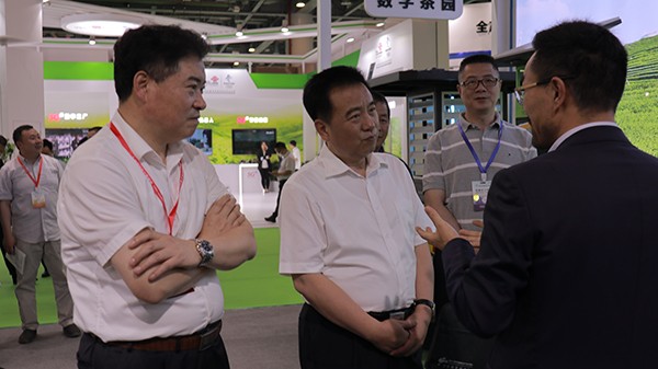 全國(guó)農(nóng)業(yè)技術(shù)推廣服務(wù)中心主任魏?jiǎn)⑽模ㄗ蠖、園藝處處長(zhǎng)周澤宇(左一)、副處長(zhǎng)冷楊(右一)參觀托普云農(nóng)展位