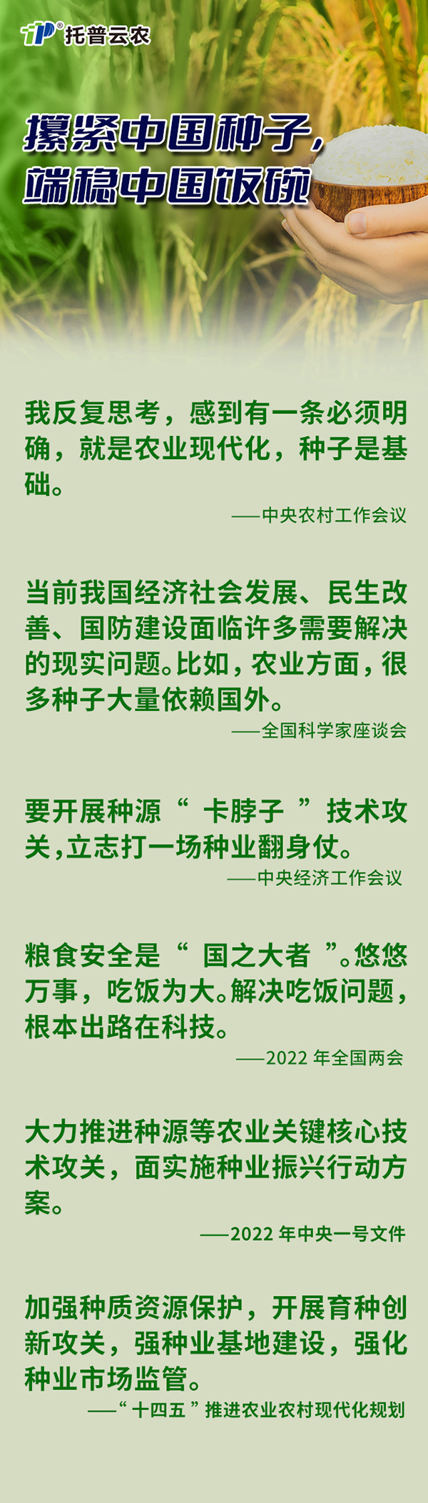 “種子是我國糧食安全的關(guān)鍵。只有用自己的手攥緊中國種子,才能端穩(wěn)中國飯碗,才能實(shí)現(xiàn)糧食安全!边@不是中央第一次提到種業(yè)發(fā)展問題,從中央農(nóng)村工作會(huì)議到“十四五”農(nóng)業(yè)農(nóng)村現(xiàn)代化發(fā)展規(guī)劃多次提出要把“種業(yè)發(fā)展”放到事關(guān)發(fā)展全局和國家安全的戰(zhàn)略大事上。