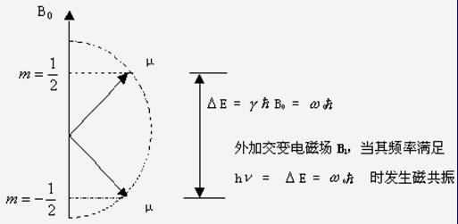 1H的自旋量子數(shù)是I=1/2,所以自旋磁量子數(shù)m=±1/2,即氫原子核在外磁場(chǎng)中應(yīng)有兩種取向。1H的兩種取向代表了兩種不同的能級(jí), 因此1H發(fā)生核磁共振的條件是必須使電磁波的輻射頻率等于1H的進(jìn)動(dòng)頻率。