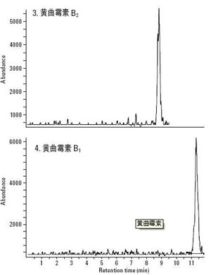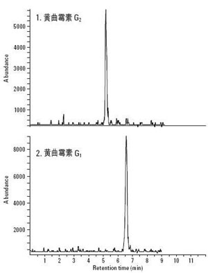 黃曲霉素是黃曲霉菌、寄生曲霉菌產(chǎn)生的代謝物,劇毒,同時有致癌、致畸等作用。會引起人體骨骼,內(nèi)臟器官等的病變,甚至癌變。黃曲霉菌廣泛存在于土壤中,因此一般的作物如花生、玉米、大米等農(nóng)作物都很容易感染黃曲霉菌。另外如胡桃、杏仁等干果也可能含有黃曲霉素。黃曲霉素的產(chǎn)生,不僅在種植過程中,還包括加工過程。黃曲霉素分為四種,B1、B2、G1、G2,其中黃曲霉素b1毒性最大。下面介紹下這四種黃曲霉素的MRM色譜圖。