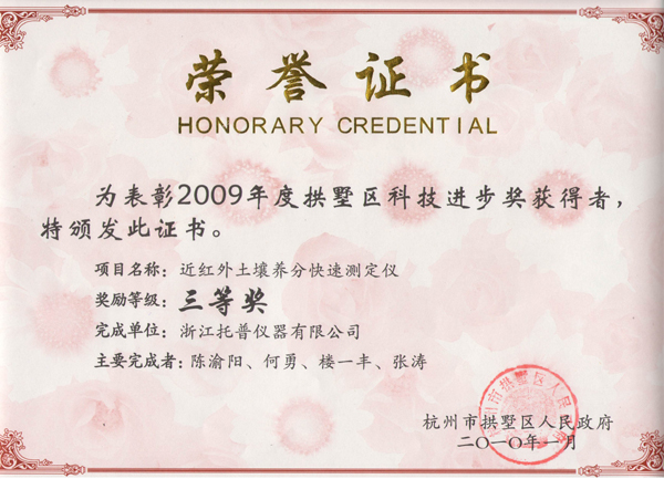 下圖是近紅外土壤養(yǎng)分快速測定儀被評為拱墅區(qū)科學(xué)技術(shù)進步獎三等獎。