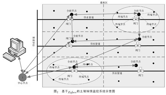 一般情況下, 根據(jù)灌溉工具在灌溉區(qū)的實(shí)際灌溉能力, 可將灌溉區(qū)劃分為若干個小灌溉塊,這些小灌溉塊通?捎1個全能節(jié)點(diǎn)和若干個終端節(jié)點(diǎn)組成一個小型的星型網(wǎng)絡(luò), 然后由全能節(jié)點(diǎn)控制小灌溉塊的供水閥門, 并由終端節(jié)點(diǎn)負(fù)責(zé)采集該灌溉塊各個區(qū)域的土壤墑情。各個小灌溉塊之間的全能節(jié)點(diǎn)、終端節(jié)點(diǎn)與中心互連, 以構(gòu)成一個WSN網(wǎng)絡(luò), 網(wǎng)絡(luò)中只起路由功能的全能節(jié)點(diǎn), 可以保證網(wǎng)絡(luò)通信的可靠性。網(wǎng)絡(luò)組建成功后, 終端節(jié)點(diǎn)將定時采集土壤濕度數(shù)據(jù), 并將數(shù)據(jù)直接上傳給中心節(jié)點(diǎn), 同時也可以利用WSN網(wǎng)絡(luò)的多跳功能將數(shù)據(jù)傳輸給上級的全能節(jié)點(diǎn), 然后通過若干個全能節(jié)點(diǎn)地接力, 將數(shù)據(jù)傳送給中心節(jié)點(diǎn)。中心節(jié)點(diǎn)對信號進(jìn)行分析后, 再將分析結(jié)果發(fā)送給該小灌溉塊的全能節(jié)點(diǎn), 并通過全能節(jié)點(diǎn)來控制閥門以調(diào)節(jié)灌溉用水的用量;赯igbee的土壤墑情監(jiān)控系統(tǒng)示意圖如圖1所示。