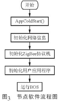 WSN網(wǎng)絡(luò)中各類節(jié)點(diǎn)的軟件流程如圖3所示。不同節(jié)點(diǎn)的軟件差異主要在于Zigbee協(xié)議棧的初始化。由于中心節(jié)點(diǎn)是網(wǎng)絡(luò)的建立者, 故在整個WSN網(wǎng)絡(luò)中必須最先啟動。在初始化Zigbee協(xié)議棧時, 通過調(diào)用afmeAddSimpleDesc () 函數(shù), 可在該函數(shù)中完成信道選擇并確定PAN ID, 從而完成網(wǎng)絡(luò)組建。全能節(jié)點(diǎn)和終端節(jié)點(diǎn)則可在初始化Zigbee協(xié)議棧時, 通過調(diào)用afmeAddSimpleDesc ()函數(shù), 將待入網(wǎng)的節(jié)點(diǎn)初始化為全能節(jié)點(diǎn)或是終端節(jié)點(diǎn), 然后掃描所有可用信道以尋找與自身PAN ID匹配的網(wǎng)絡(luò)。當(dāng)掃描到匹配網(wǎng)絡(luò)后, 待入網(wǎng)節(jié)點(diǎn)將向中心節(jié)點(diǎn)發(fā)送入網(wǎng)請求數(shù)據(jù)幀, 當(dāng)接