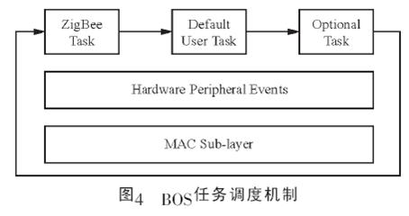 BOS 系統(tǒng)可控制執(zhí)行Zigbee Task 和DefaultUser Task, 其中Zigbee Task可作為單獨(dú)任務(wù)被執(zhí)行, APS (Application Sub-layer) 和ZDO (ZigbeeDevice Objects) 都在Zigbee Task中執(zhí)行。DefaultUser Task則在BOS系統(tǒng)初始化時被創(chuàng)建。BOS系統(tǒng)初始化時, 最多可以定義兩個User Task, 根據(jù)功能實(shí)現(xiàn)的需要, 可以在Default User Task中定義應(yīng)用程序。Hardware Peripheral Event 和MACSub-Layer等屬于隨即事件, 可以中斷的形式在Optional Task中處理。