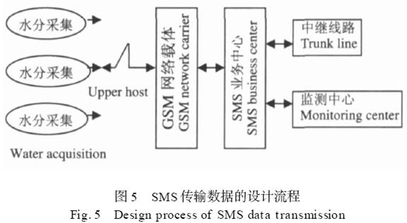 SMS(Short Messaging Service) 短消息業(yè)務(wù)是GSM 網(wǎng)的一項(xiàng)增值業(yè)務(wù),通過(guò)控制信道傳輸數(shù)據(jù),支持點(diǎn)對(duì)點(diǎn)消息業(yè)務(wù)及消息廣播業(yè)務(wù)等多種方式。水分采集的數(shù)據(jù)通過(guò)GSM 網(wǎng)全部發(fā)送到短消息業(yè)務(wù)中心,監(jiān)控中心通過(guò)中繼線路DDN (Digital Data Network) 從短消息業(yè)務(wù)中心獲取數(shù)據(jù) 。