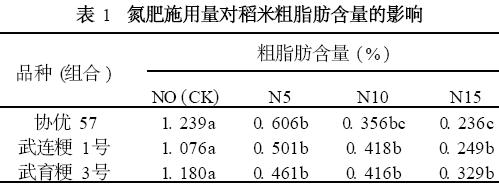 從表1中可以看出,后期不同氮肥施用量對3個品種(組合)的影響基本一致,粗脂肪含量均隨著氮肥施用量的提高而下降,且與對照差異顯著;但在N5、N10、N15 不同施肥量處理間下降趨勢比較平緩,其差異性各品種表現不一,其中武育粳3號、武連粳1號均不顯著,僅協(xié)優(yōu)57 的N5與N15處理分別為0. 606%和0. 236% ,差異顯著。品種間隨著氮肥量的增加,粗脂肪含量的下降趨勢有所不同,其中武育粳3號4個處理的粗脂肪含量分別為1. 180%、0. 461%、0. 416%、0. 329% ,下降趨勢稍緩于其他兩個品種(組合) 。以上結果表明,后期施用氮肥會顯著降低稻米粗脂肪含量,秈稻粗脂肪含量對氮肥的反應敏感性比粳稻強,但隨著氮肥用量的增加,下降趨勢變緩。
