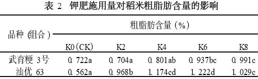 表2結果顯示,供試的兩個品種(組合)除武育粳3號的K2處理粗脂肪含量為0. 704%稍低于對照0. 722%外,其余各處理均高于對照,與對照比差異顯著(K4處理除外) ;武育粳3 號隨著施鉀量的增加而提高,汕優(yōu)63 則在超過K6 水平時顯著下降。以上結果表明,施用一定量鉀肥能增加稻米粗脂肪含量。