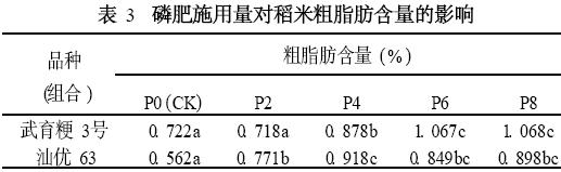 表3結果顯示,兩個品種(組合)的粗脂肪含量施磷肥處理均比對照要高,除P2處理的武育粳3號與對照差異不顯著外,其余均差異顯著,其中汕優(yōu)63在低于P4水平下,粗脂肪含量增加明顯,而武育粳3號在高于P2水平后,隨著施磷量的增加粗脂肪含量增加明顯。以上研究結果表明,施用磷肥能顯著增加稻米粗脂肪含量。