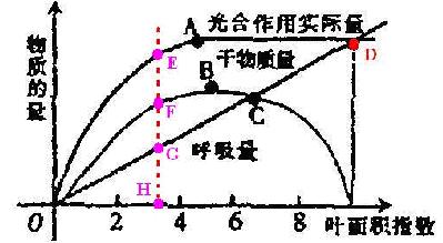 OAD:OA段,隨葉面積指數(shù)的增加,光合作用實際量增加;過A點以后,隨葉面積指數(shù)的增加,光合作用實際量不再增加并為一定值。