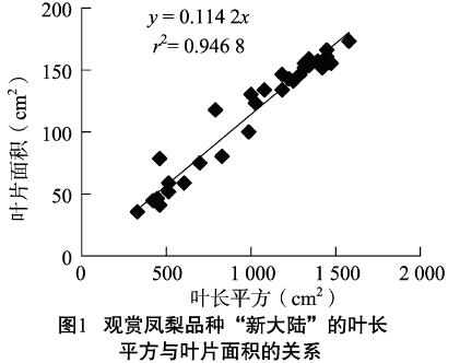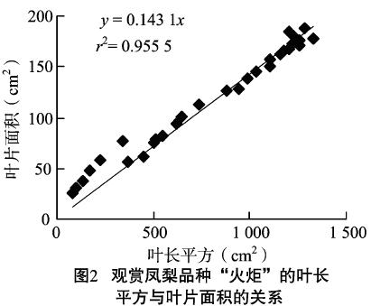 2. 3. 1 回歸方程的獲得 由圖1和圖2可知,“新大陸”和“火炬”2個(gè)觀賞鳳梨品種葉長(zhǎng)的平方與葉片面積都存在著顯著的線性相關(guān)關(guān)系!靶麓箨憽逼贩N,由葉長(zhǎng)計(jì)算葉片面積的公式為:葉面積(LA)= 0. 114 2 ×葉長(zhǎng)平方(L2 ) , r2 = 0. 946 8;“火炬”品種,由葉長(zhǎng)計(jì)算葉片面積的公式為:葉面積(LA) =0. 143 1 ×葉長(zhǎng)平方(L2 ) , r2 = 0. 955 5。