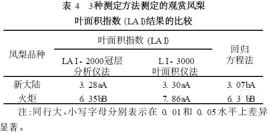 從表4可以看出,“新大陸”品種, 3種方法測(cè)定的結(jié)果在0. 01水平上沒(méi)有顯著差異;而“火炬”品種,L I - 3000葉面積儀法與另外2種方法的測(cè)定結(jié)果在0. 05和0. 01水平都存在顯著差異?傮w上,L I - 3000葉面積儀法的測(cè)定結(jié)果均高于LA I - 2000冠層分析儀法和回歸方程法。