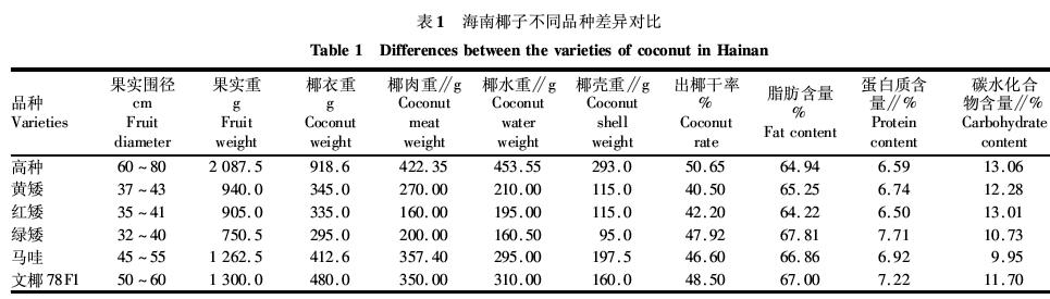 椰子種質(zhì)資源的特性是決定其開(kāi)發(fā)價(jià)值的主要因素,因此科研人員針對(duì)海南椰子,選取了海南高種、馬哇、文椰78F1、黃矮、綠矮和紅矮6個(gè)品種作為分析對(duì)象。通過(guò)分析其特性,總結(jié)出了它們之間的差異性和穩(wěn)定性。其中各類品種的椰子都能夠從種質(zhì)資源庫(kù)得到。