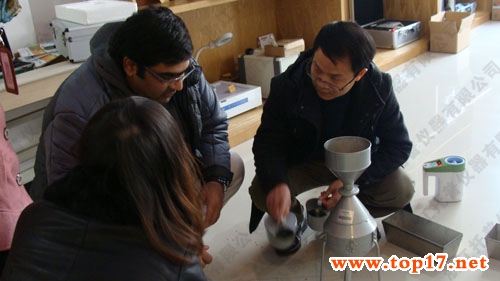圖為:外國客戶親自動手演示鐘鼎式分樣器,并不時提問