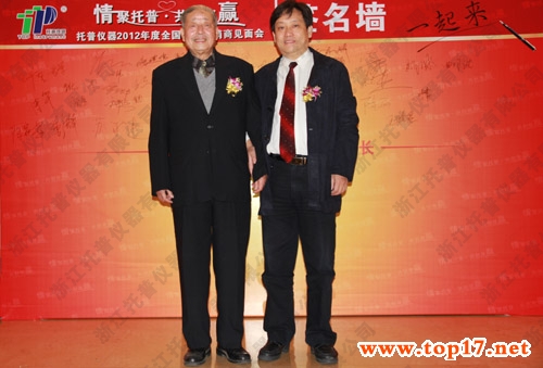 圖為:陳子元院士與高祥照處長在托普經銷商見面會簽名墻前合影留念