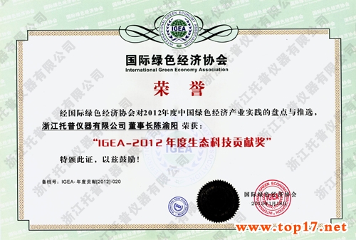 浙江托普儀器有限公司陳渝陽總經(jīng)理應(yīng)邀出席此次會議,并榮獲由國際綠色經(jīng)濟協(xié)會頒發(fā)的“IGEA—2012年度生態(tài)科技貢獻獎”,此獎項是經(jīng)國際綠色經(jīng)濟協(xié)會對2012年度中國綠色經(jīng)濟產(chǎn)業(yè)時間的盤點與推選而獲得。