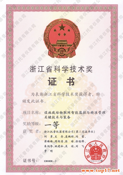 為了鼓勵科學(xué)技術(shù)創(chuàng)新,促進(jìn)科學(xué)技術(shù)進(jìn)步和社會經(jīng)濟發(fā)展,根據(jù)《浙江省科學(xué)技術(shù)獎勵辦法》,托普儀器的科研項目——《設(shè)施栽培物聯(lián)網(wǎng)智能監(jiān)控與精準(zhǔn)管理關(guān)鍵技術(shù)與裝備》,經(jīng)過省科學(xué)技術(shù)評審委員會審定,被評為2012年度浙江省科學(xué)技術(shù)獎一等獎。