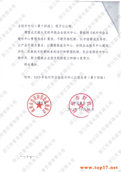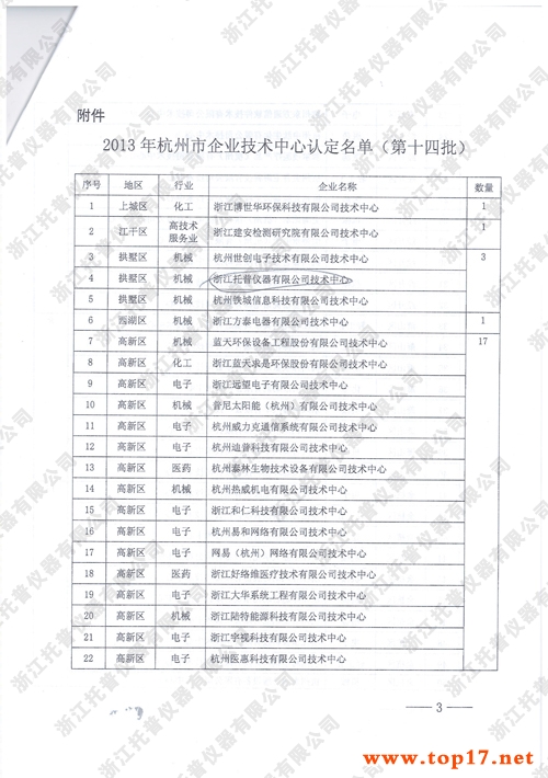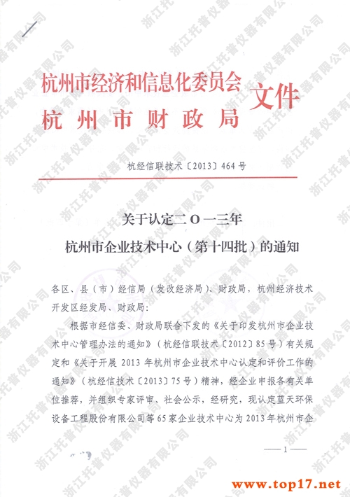 經(jīng)企業(yè)申報(bào)各有關(guān)單位推薦,并組織專家評審、社會(huì)公示、經(jīng)杭州市經(jīng)信委和財(cái)政局研究認(rèn)定浙江托普儀器有限公司等65家企業(yè)技術(shù)中心為2013年杭州市企業(yè)技術(shù)中心(第十四批)。