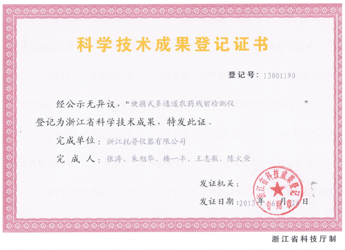 熱烈祝賀托普便攜式多通道農(nóng)藥殘留檢測儀獲得科學(xué)技術(shù)成果登記證書