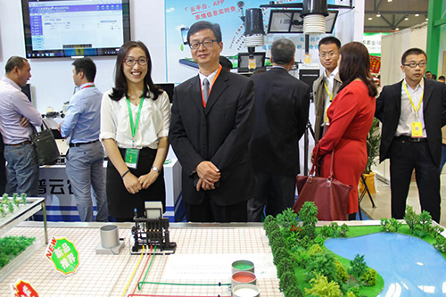 雙交會期間,全國農(nóng)業(yè)技術(shù)推廣服務中心陳生斗主任、謝建華副主任一行蒞臨托普云農(nóng)展區(qū),觀摩了公司展出的水肥一體化智能監(jiān)控系統(tǒng)和土壤墑情監(jiān)控預警平臺與設備,并且與托普云農(nóng)營銷總監(jiān)陳麗婷親切交流。