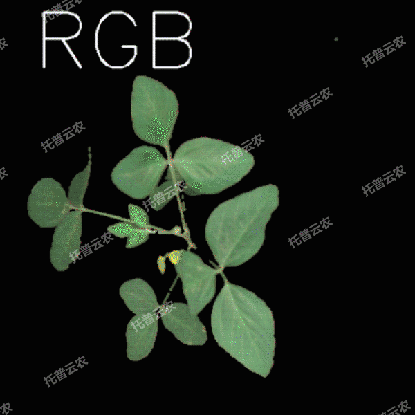 可見(jiàn)光二維成像單元:獲取植株側(cè)視可見(jiàn)光圖像,并利用人工智能算法分析獲取株高、葉頂點(diǎn)數(shù)、投影面積等形態(tài)參數(shù),黃色投影面積、綠色投影面積等顏色參數(shù),以及平滑度等紋理參數(shù),用于植株株型與健康狀態(tài)相關(guān)表型分析。