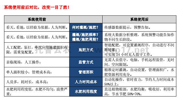 整個系統(tǒng)可根據(jù)監(jiān)測的土壤水分、作物種類的需肥規(guī)律,設(shè)置周期性水肥計劃實施輪灌。施肥機會按照用戶設(shè)定的配方、灌溉過程參數(shù)自動控制灌溉量、吸肥量、肥液濃度、酸堿度等水肥過程的重要參數(shù),實現(xiàn)對灌溉、施肥的定時、定量控制,充分提高水肥利用率,實現(xiàn)節(jié)水、節(jié)肥,改善土壤環(huán)境,提高作物品質(zhì)的目的。該系統(tǒng)廣泛應(yīng)用于大田、旱田、溫室、果園等種植灌溉作業(yè)。