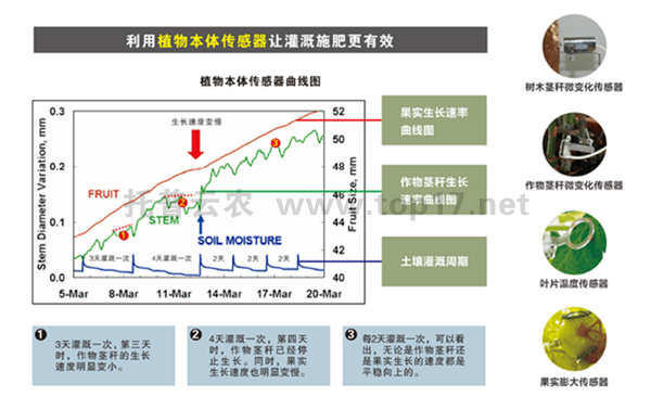 植物本體傳感器,能實時或階段性地監(jiān)測植物莖稈粗細的變化、葉面的溫度、莖流速率、果實增重與膨大速率、植物的光合作用等植物本身的一些參數(shù),能直觀地反應(yīng)植物的生長狀態(tài)。