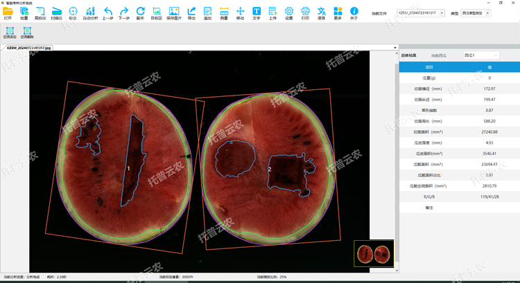 8.瓜果表型分析:用于測量西瓜切面的瓜瓤、瓜皮等果形指標,可自動分析切面橫徑、切面縱徑、果形指數、切面周長、切面面積、瓜皮厚度、瓜皮面積、瓜瓤面積、瓜瓤空洞面積、顏色以及瓜重等果形參數,軟件支持圓形水果表型測定,也可支持定制其它園藝作物果實切面表型指標。常用于西瓜果實育種、西瓜關鍵基因定位、逆境脅迫、西瓜表型指標測定等領域。