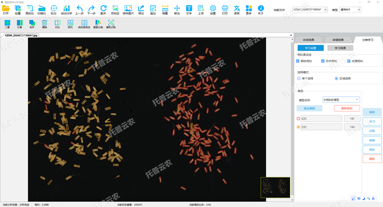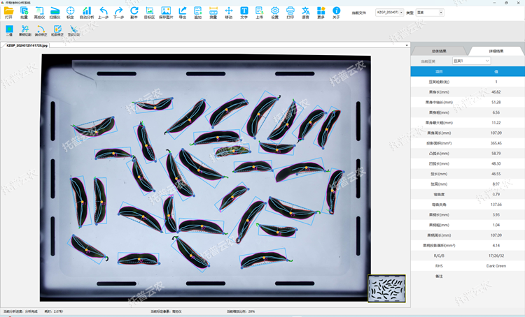 14.智能對比:能精準顯示種粒外接矩形,對不同品種的種子進行長和寬的對比,并輸出排列、對比圖。深度學習:根據顏色或是形狀的不同對種子進行自學習和再學習,并實現(xiàn)自動分類識別。