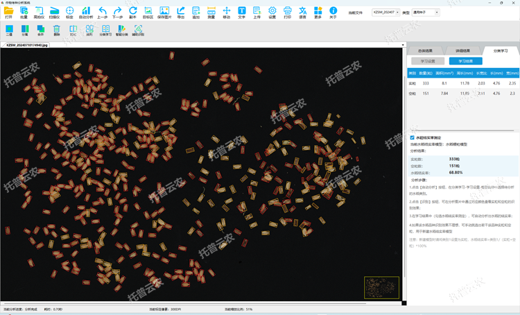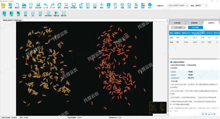 2.水稻結實率分析:能精準顯示種粒外接矩形,得出空粒數,實粒數,結實率百分比數據,并可直接標記空粒、實粒,顯示各籽粒粒型數據(長、寬、長寬比、面積、周長),可預設水稻粳粒結實率模型和水稻秈粒結實率模型,并支持根據自己的品種重新學習建模。