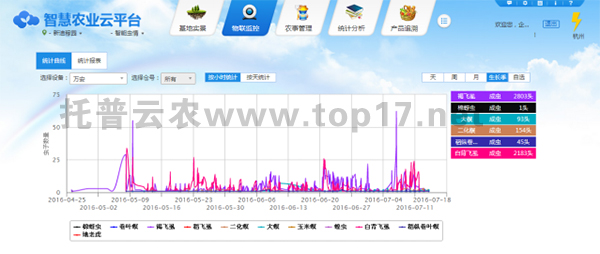 3.病蟲害預(yù)警系統(tǒng):對可遷移性害蟲實時分析,對即將發(fā)生及已發(fā)生蟲害區(qū)域做出決策,區(qū)域病蟲害信息可形成對比曲線。